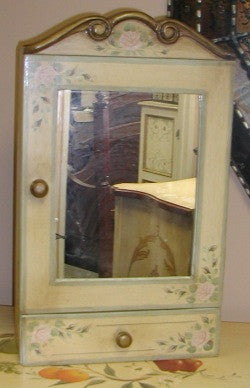 Medicine cabinet. 1 door and 1 drawer. Available in Roses and sage green (shown), Grape, Florentino, Colonial, or French Country painted designs. Can also be used as curio. Shelves inside door. 24"H x 14"W x 5 1/2"D