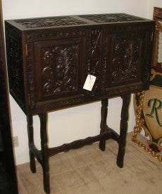 Spanish style vargueno. Hand carved on top, sides and doors, one shelf. 43"w x 55"h x 17 1/2"d. We specialize in Spanish Revival, Spanish Colonial, Tuscan, Old World, Renaissance, Italian Villa, Mediterranean, Gothic, Medieval, Monterey, Classic Western, and Cowboy chic designs. Custom designs available.